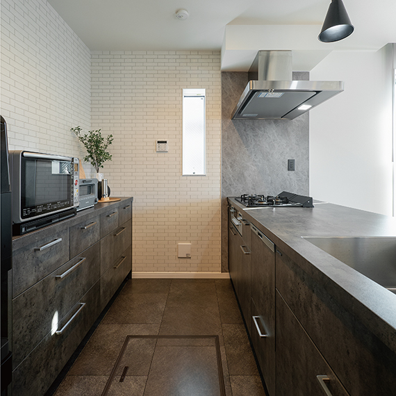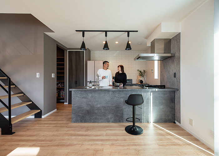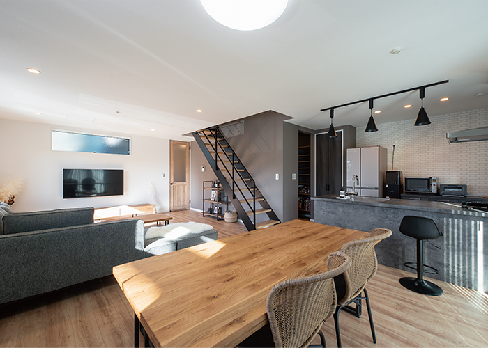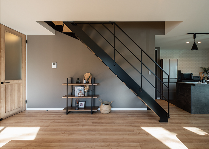ブラックとグレー、そして木目で空間をセンス良くコーディネート。2階へのアクセスは空間のアクセントになるスケルトン階段に。家族のコミュニケーションが増えるリビング階段を採用した。