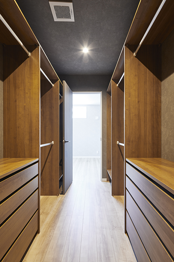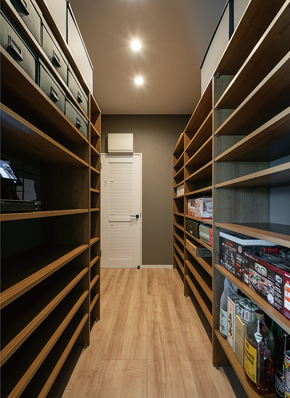 エントランスホールから、パントリーを通りキッチンへ。帰宅後すぐに買ってきたものを収納し、そのままキッチンにいけるからストレスフリー。こまごまとしたもので溢れがちなキッチン周りのものは、ほとんどパントリーに収納できるので、キッチン全体がスッキリし快適に料理ができるように。