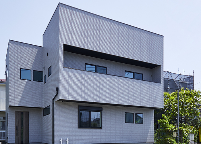 落ち着いた色合いながら存在感のある外観はシンプルモダンな内観との相性もバッチリ。玄関ドアは木目を用いてアクセントに。